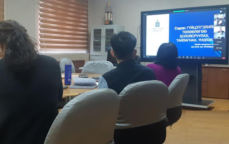 2023/12/06Эрүүл мэндийн салбарын удирдах ажилтны цахим сургалтыг “Гүйцэтгэлийн төлөвлөгөө боловсруулах, тайлагнах, үнэлэх нь” сэдвээр зохион байгуулж хичээлийг Удирдлагын академийн Төрийн захиргааны тэнхимийн багш, Доктор, Дэд профессор М.Амартүвшин заалаа.