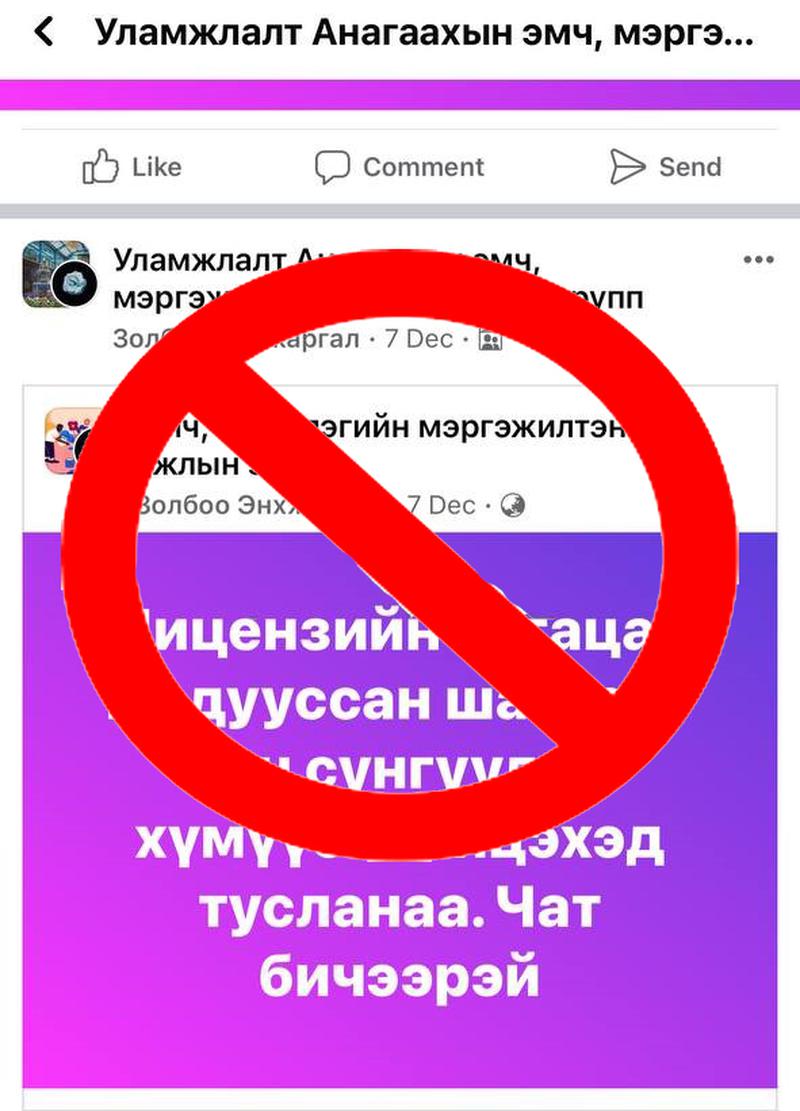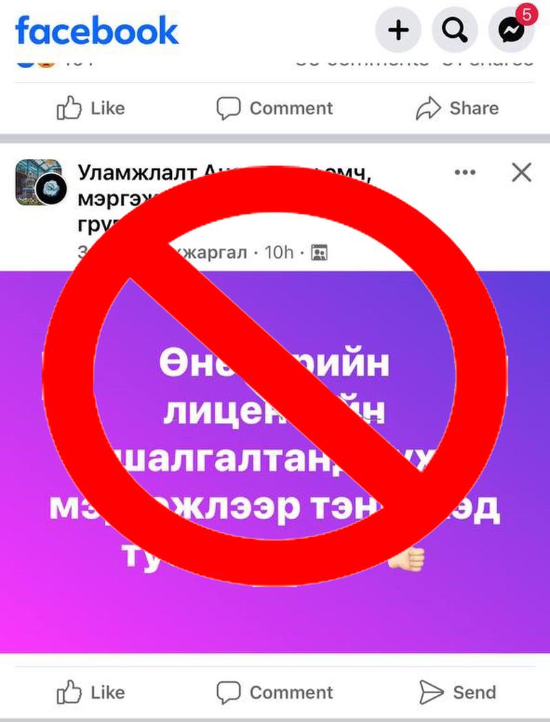 Сүүлийн үед Facebook-ээр “Лицензийн шалгалтанд бүх мэргэжлээр тэнцэхэд туслана” гэсэн зарууд их явж байгаа тул эмнэлгийн мэргэжилтнүүд худал мэдээлэлд хууртан залилуулахгүй байх, цаашлаад хүний өмнөөс шалгалт өгсөн болон хүнээр шалгалт өгүүлсэн зэрэг тохиолдолд Зөвшөөрлийн тухай хуулийн 6.2.1.6 заасны дагуу зөвшөөрлийг хүчингүй болгох, мэргэжлээрээ ажиллах боломжгүй болох зэрэг хор нөлөө, сөрөг үр дагавар үүсэж болзошгүй тул та бүхэнд анхааруулга сэрэмжлүүлэг хүргэж байна.