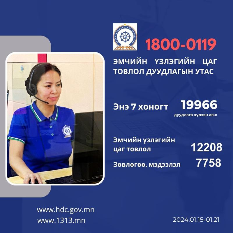 1800-0119 тусгай дугаарын "Эмчийн үзлэгийн цаг захиалга"-ын дуудлагын утасны 7 хоногийн мэдээ