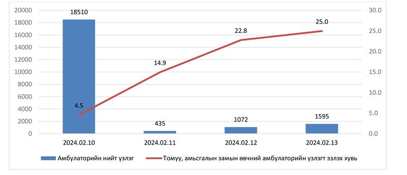 Улсын хэмжээнд хүлээн авах, яаралтай тусламжийн тасгаар 02 сарын 10-аас 02 сарын 13-ны өдрийн мэдээгээр нийт 11790 хүн үйлчлүүлсэн. Үүнээс 6202 буюу 52.6 нь насанд хүрэгчид, 5588 буюу 47.4 хувь нь хүүхэд байна. Хүлээн авах, яаралтай тусламжийн тасгаар үйлчлүүлсэн насанд хүрэгчдийн 14.0% (870), хүүхдийн 7.9% (439) нь осол гэмтлийн шалтгаантай байна.