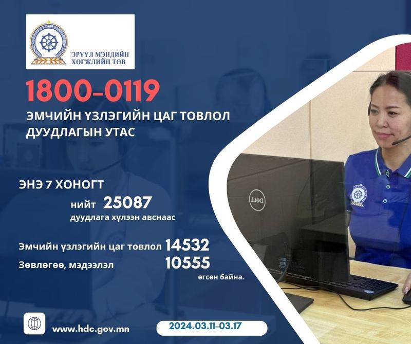 1800-0119 тусгай дугаарын "Эмчийн үзлэгийн цаг захиалга"-ын дуудлагын утасны 7 хоногийн мэдээ