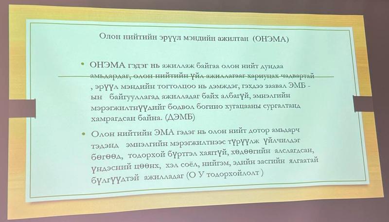 Иймээс манай төв Глобаль сан, НҮБ-ын Хүүхдийн сантай хамтран ДЭМБ-аас гаргасан ОНЭМА-г бэлтгэх сургалтын модулийг орчуулж, өөрийн орны эрүүл мэндийн анхан шатны тусламж, үйлчилгээний тогтолцоотой уялдуулж, хянан тохируулга хийн боловсруулаад байна.