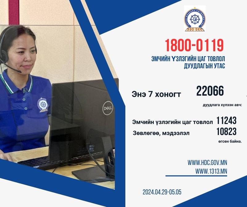 1800-0119 тусгай дугаарын "Эмчийн үзлэгийн цаг захиалга"-ын дуудлагын утасны 7 хоногийн мэдээ