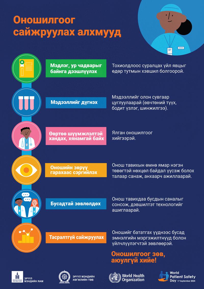 Мөн Дэлхийн үйчлүүлэгчийн аюулгүй байдлын өдрийг тэмдэглэн өнгөрүүлэх хүрээнд эрүүл мэндийн байгууллагуудын Эрүүл мэндийн тусламж, үйлчилгээ чанарын албадыг мэргэжил арга зүйгээр ханган ажиллаж байна.