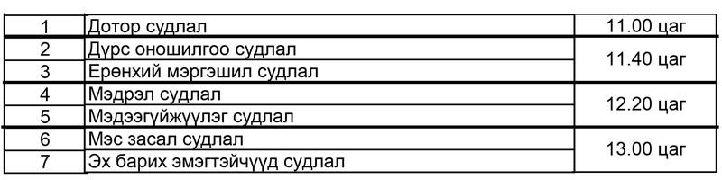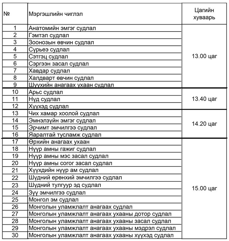 9 дүгээр сарын 26-27-ны өдрүүдэд дараах хуваарийн дагуу ЭМХТ-ийн 2-р байрны 410 тоотод зохион байгуулагдана.
