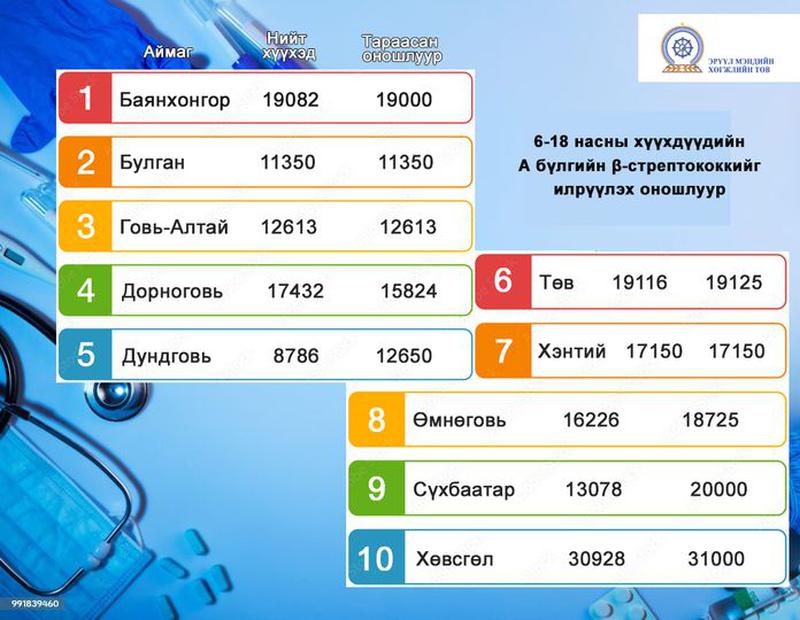 2024/10/03Тус төвөөс НҮБ-ын Хүүхдийн сан, ЭХЭМҮТ-тэй хамтран орон нутгийн хүүхдийн эмч нарт зориулан зохион байгуулсан “СТРЕПТОКОККИЙН АНГИНА, ФАРИНГИТ, ХЭРХ ӨВЧИН, ХЭРХИЙН ШАЛТГААНТ, ЗҮРХНИЙ ОЛДМОЛ ГАЖГИЙГ ЭРТ ОНОШЛОХ ЧАДАВХИ ОЛГОХ" сургалтаар бэлтгэгдсэн эмч нар тухайн орон нутгийнхаа 6-18 насны хүүхдүүдийн А бүлгийн β-стрептококкийг илрүүлэх шинжилгээ хийж байгаа юм