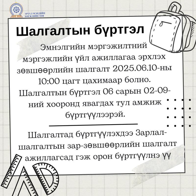 2025/06/02Эмнэлгийн мэргэжилтний мэргэжлийн үйл ажиллагаа эрхлэх зөвшөөрлийн шалгалт 2025.06.10-ны 10:00 цагт цахимаар болно. Шалгалтын бүртгэл 06 сарын 02-09-ний хооронд явагдах тул амжиж бүртгүүлээрэй.